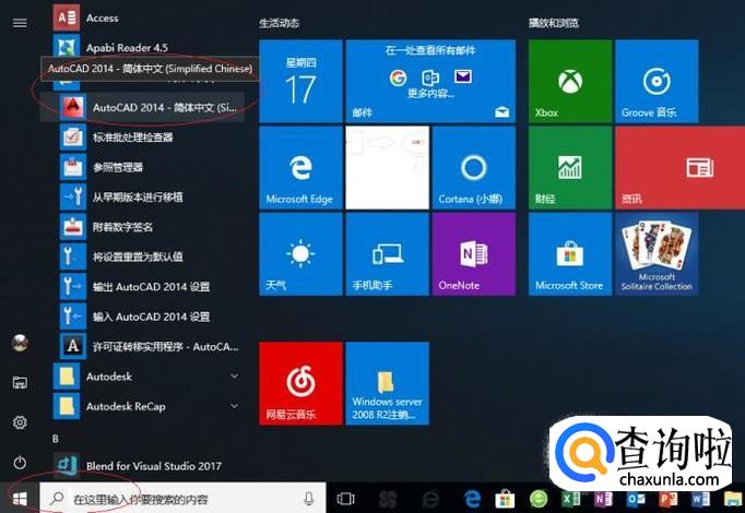 启动Windows 10操作系统,如图所示。点击任务栏"开始"按钮,弹出开始菜单选择"AutoCAD 2014 简体中文"项。
