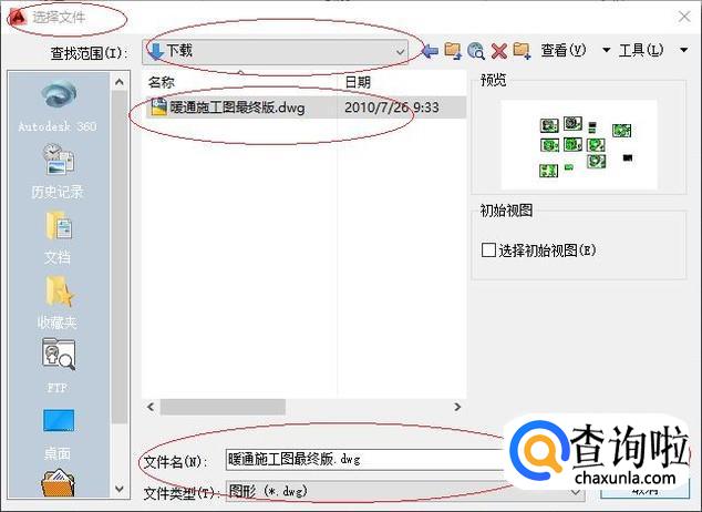 弹出"选择文件"对话框,如图所示。点击"查找范围"右侧下拉箭头选择图纸,设置完成点击"打开"按钮。