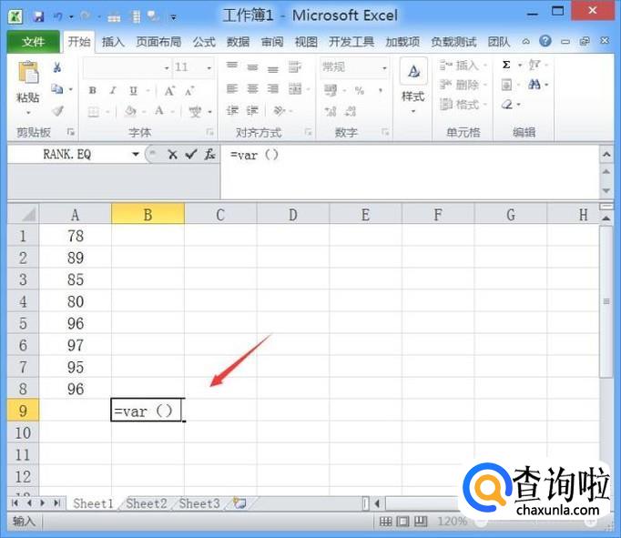 在打开的界面内我们输入数据,然后选择单元格,在单元格内我们输入方差计算函数“=var()”,如图所示: