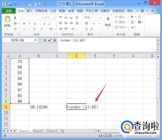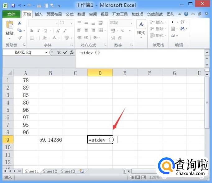 在刚刚的表格文件内我们选择另外的单元格输入均方差的计算函数“=stdev()”如图所示: