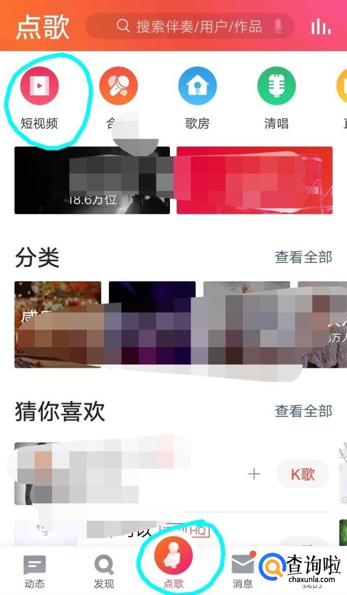 打开全民K歌后并登录,点击点歌……左上角短视频,如下图所示。