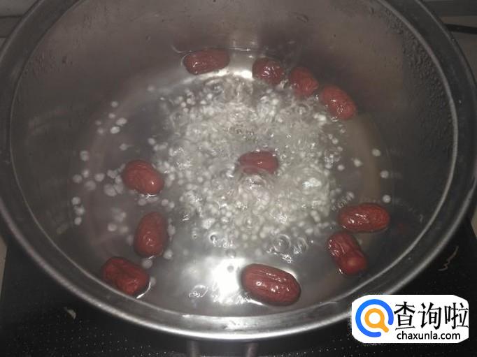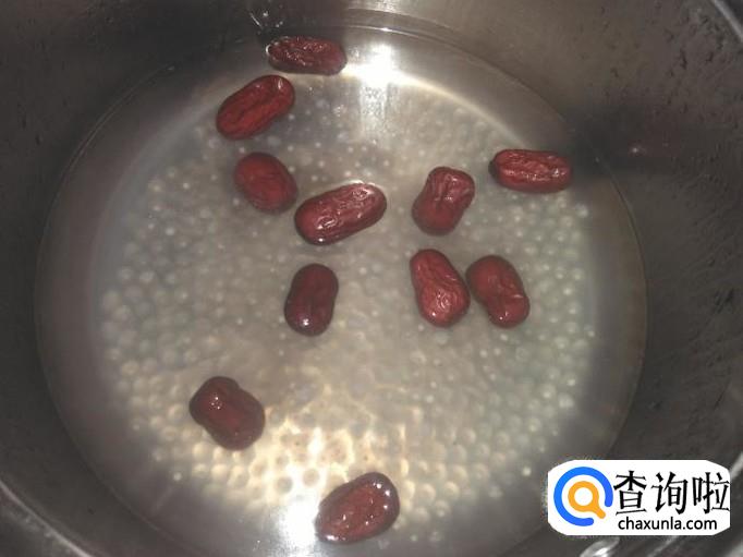 然后放红枣进去,盖上盖子煮2分钟熄火,停十几分钟再开火,每次开火都先搅拌一下,就按着这个步骤煮到西米变透明状。