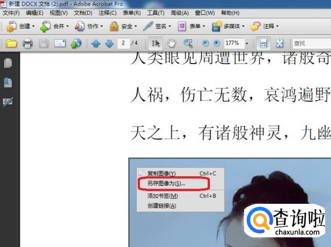 用新下载的软件打开PDF文件,如图所示,点击一下图片,就可以选中了,选中之后图片变成灰色,右键点击选择“另存图像为”。
