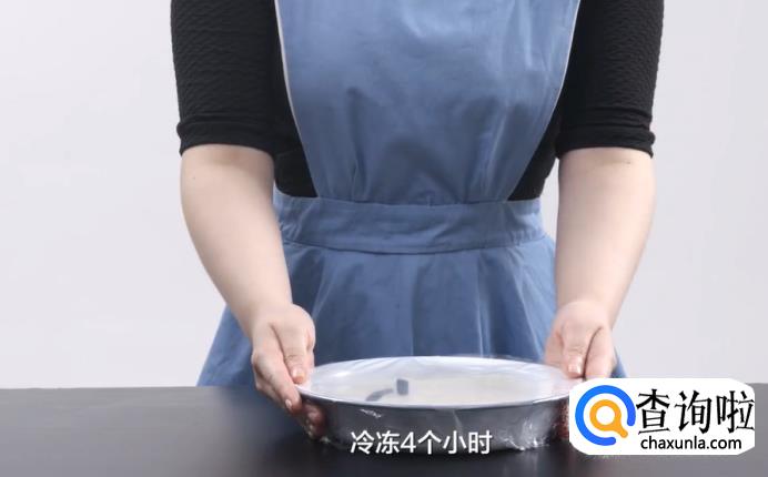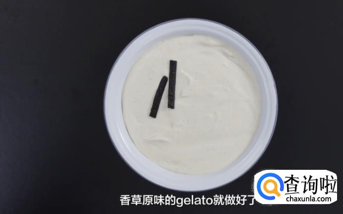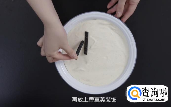 将奶酱倒入盘中,稍微抹平表面,放上香草荚装饰,再用保鲜膜覆盖在盘上,放入冰箱冷冻4个小时,香草原味的Gelato就做好了。