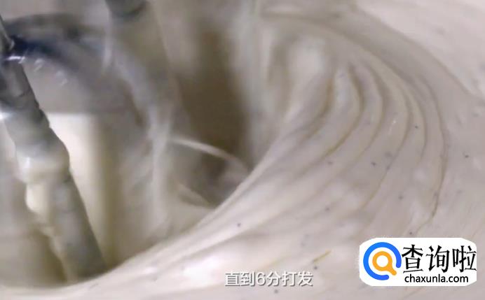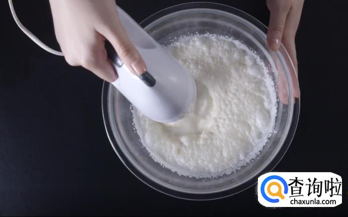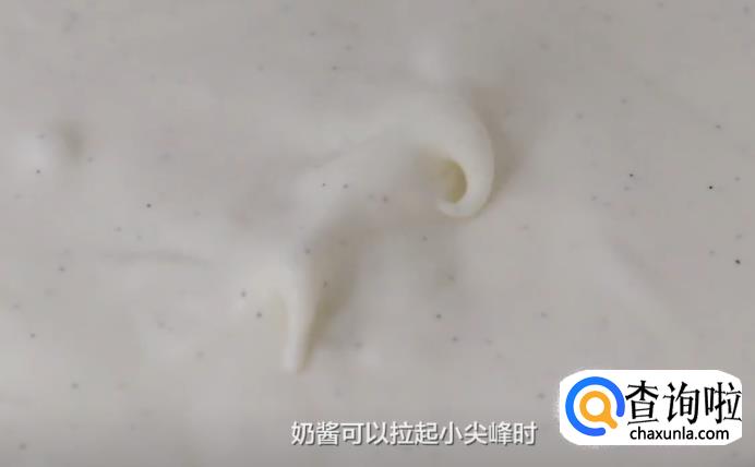 等奶油稍微变厚一些之后,加入炼乳和朗姆酒,继续搅打,直至6分打发,奶酱可以拉起小尖峰即可。