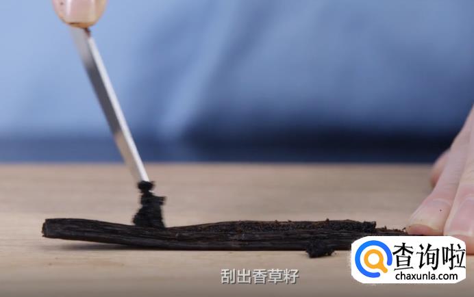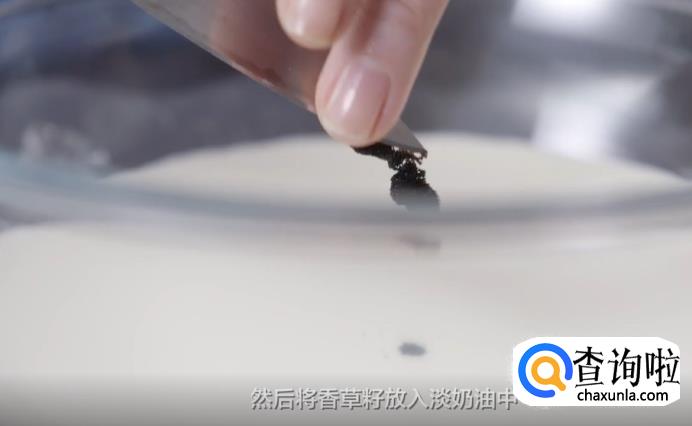 原味的Gelato要用到香草荚,先切开香草荚,将香草籽刮出来,然后将香草籽放入淡奶油中,手持搅拌器均匀划圈打发。