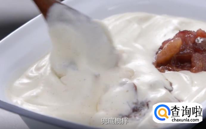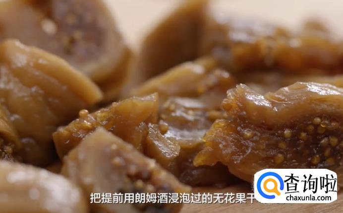 把提前用朗姆酒浸泡过的无花果干切成块,加入原味奶酱中搅拌均匀,再覆盖上保鲜膜,放入冰箱冷冻1个小时。