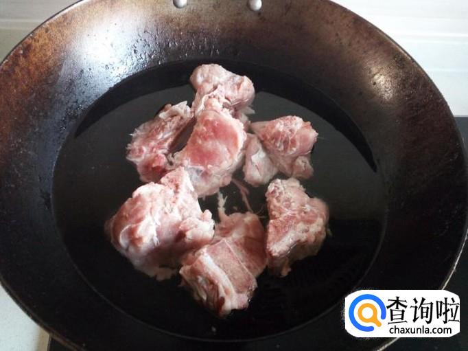把脊骨放入冷水锅中,烧开,开锅后煮一分钟,然后把脊骨捞出来,用水清洗干净(血水和沫子),沥干水分。