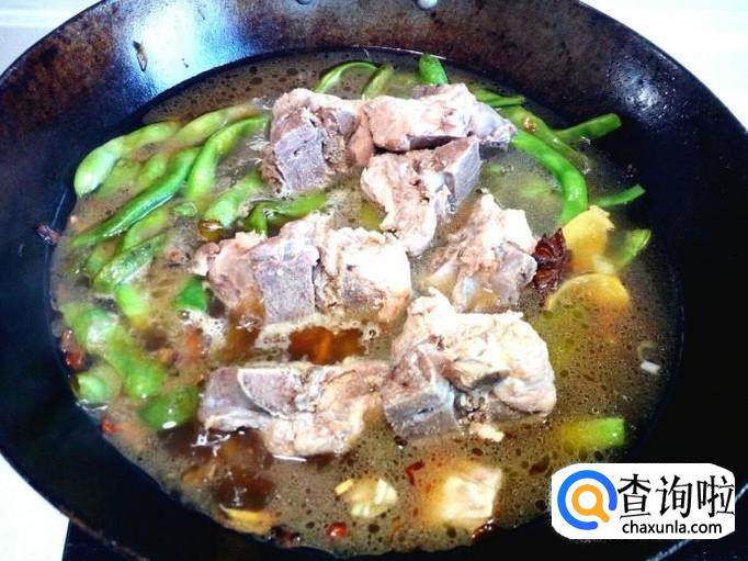 炒至芸豆无水气后,放入料酒,酱油,盐(慎重放盐,脊骨汤里含盐),略翻炒一下,然后把压熟的脊骨,脊骨汤一起放入锅中,汤没过芸豆(如果脊骨汤少,可以适当放些水),大火烧开后,转小火慢炖。