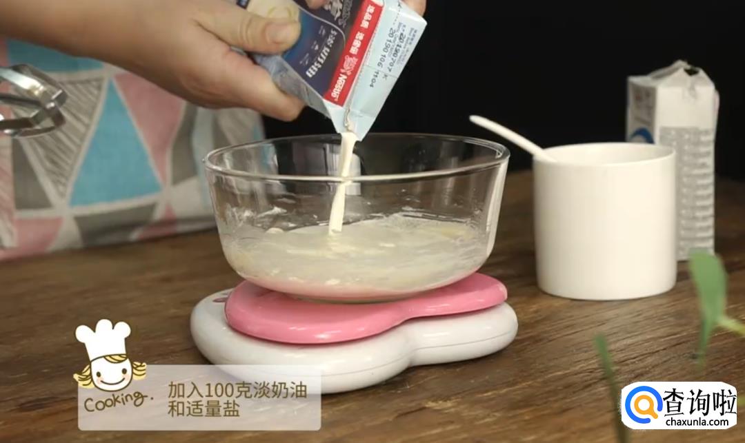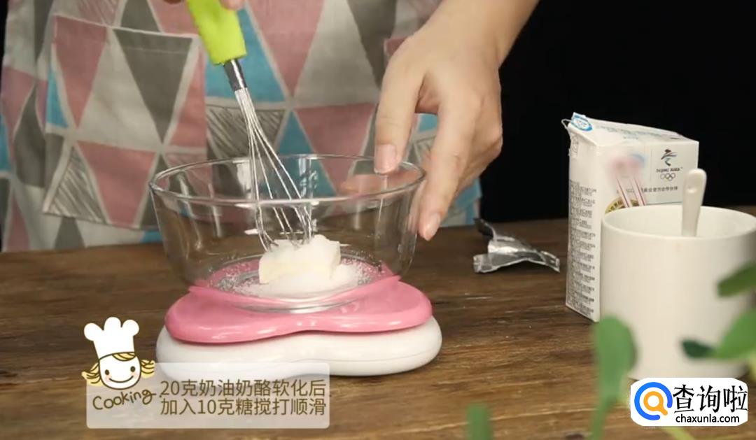 奶油奶酪软化后加入糖搅拌打顺滑,加入淡奶油和适量盐,用搅拌机打发至不流动。