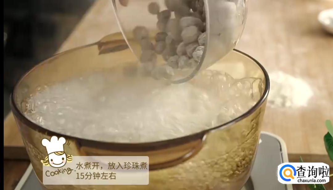水开后煮珍珠,15分钟后捞出过凉水待用。