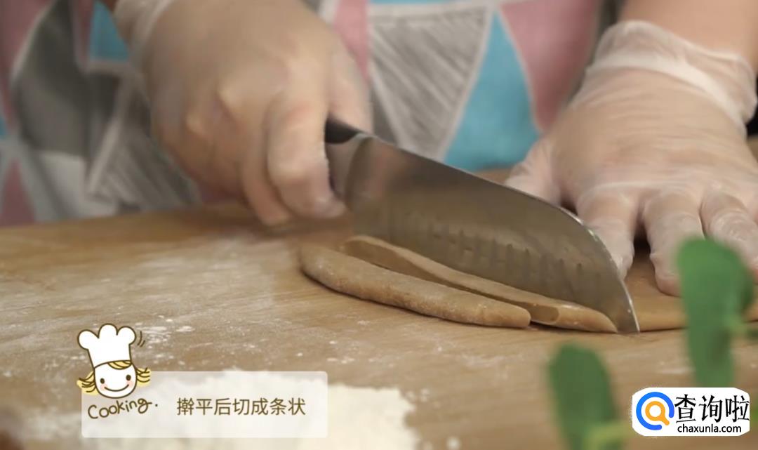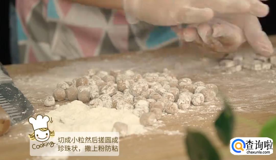 擀平面团后先切成条,再切成颗粒,然后搓圆成珍珠装,撒上粉防粘连。
