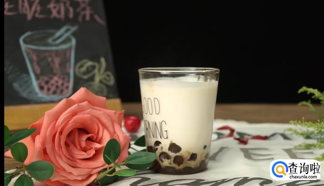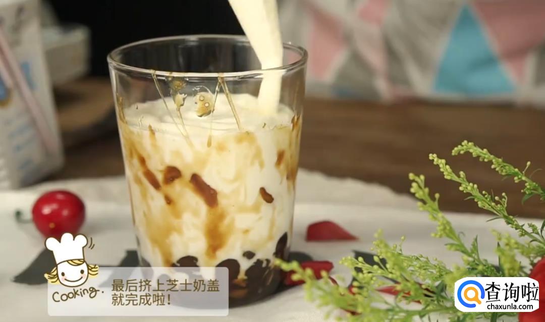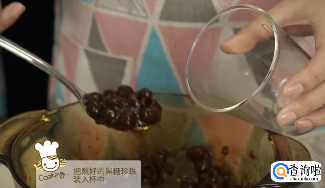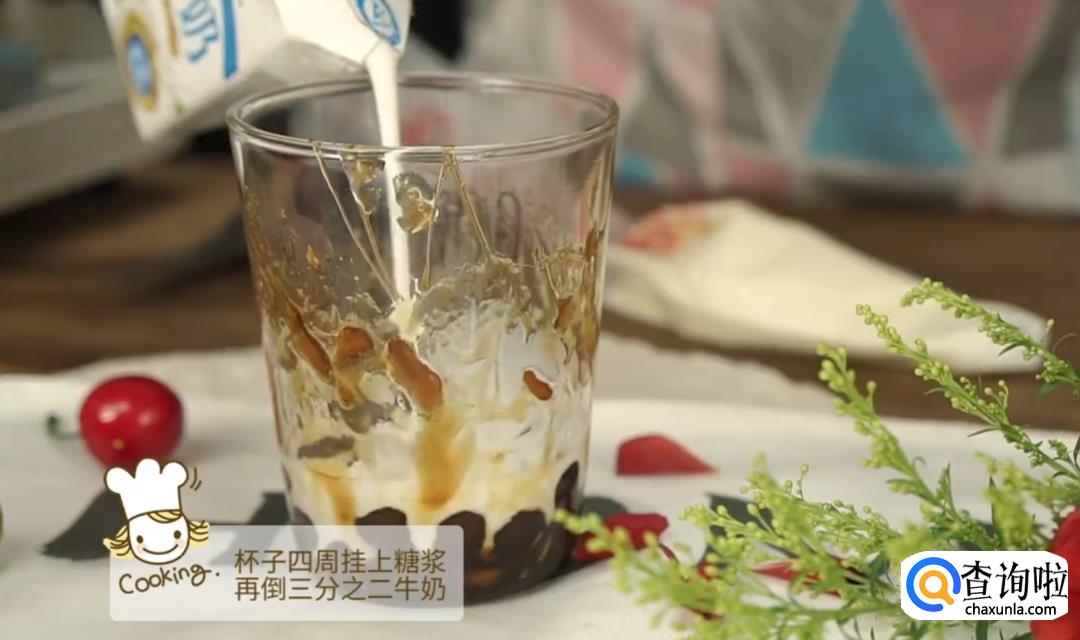 煮好的黑糖珍珠倒入杯中,在杯子的四周挂上糖浆,再倒入三分之二牛奶。