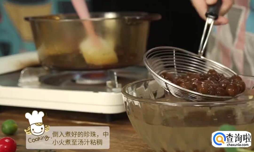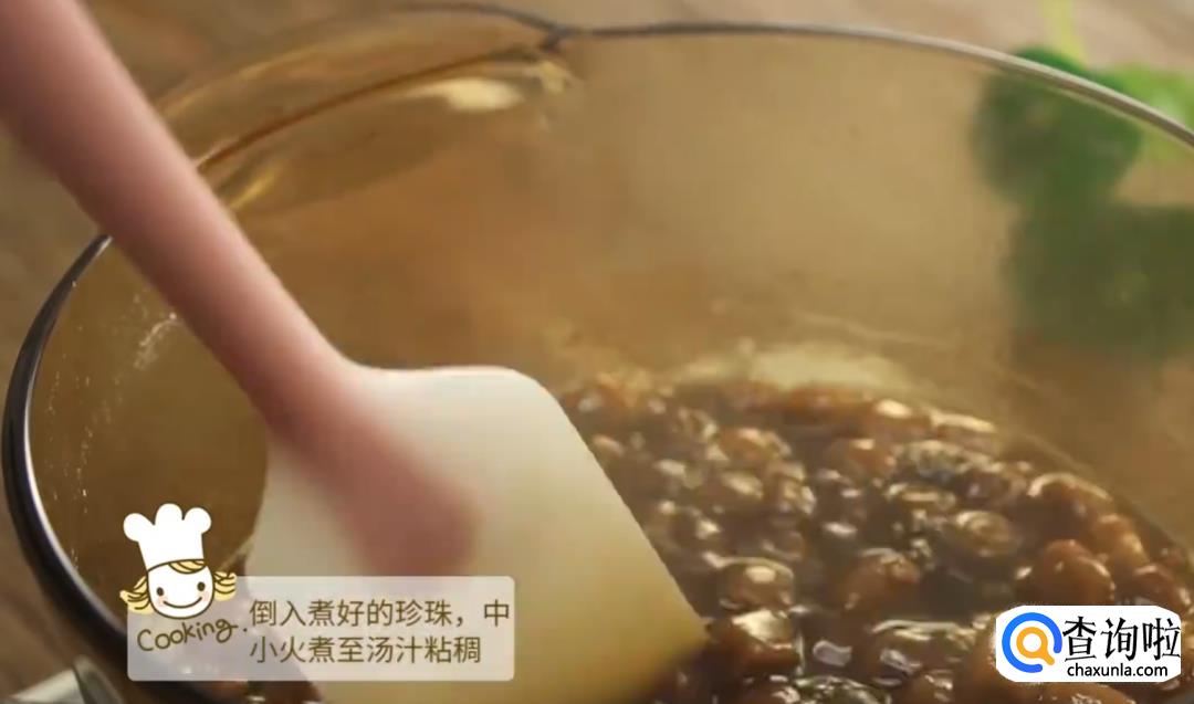 黑糖和清水煮沸,倒入煮好的珍珠,小火煮至汤汁粘稠。