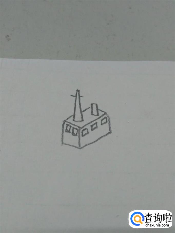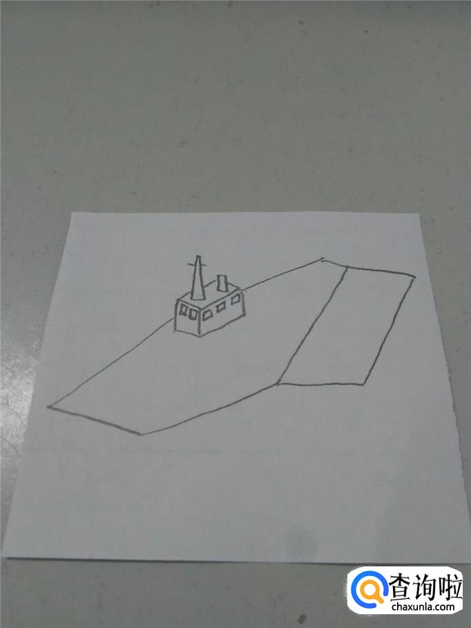 在指挥塔下,画一个长方体的框架,表示指挥塔下的屋子,在侧面画几个小的方块,表示窗口。