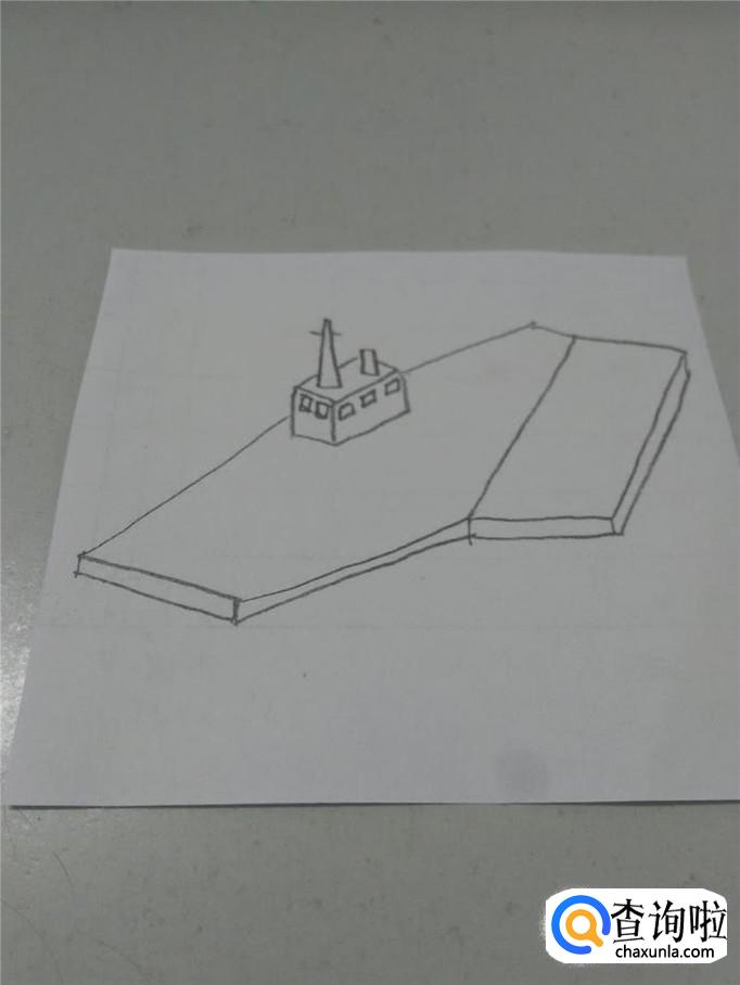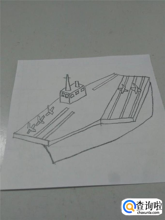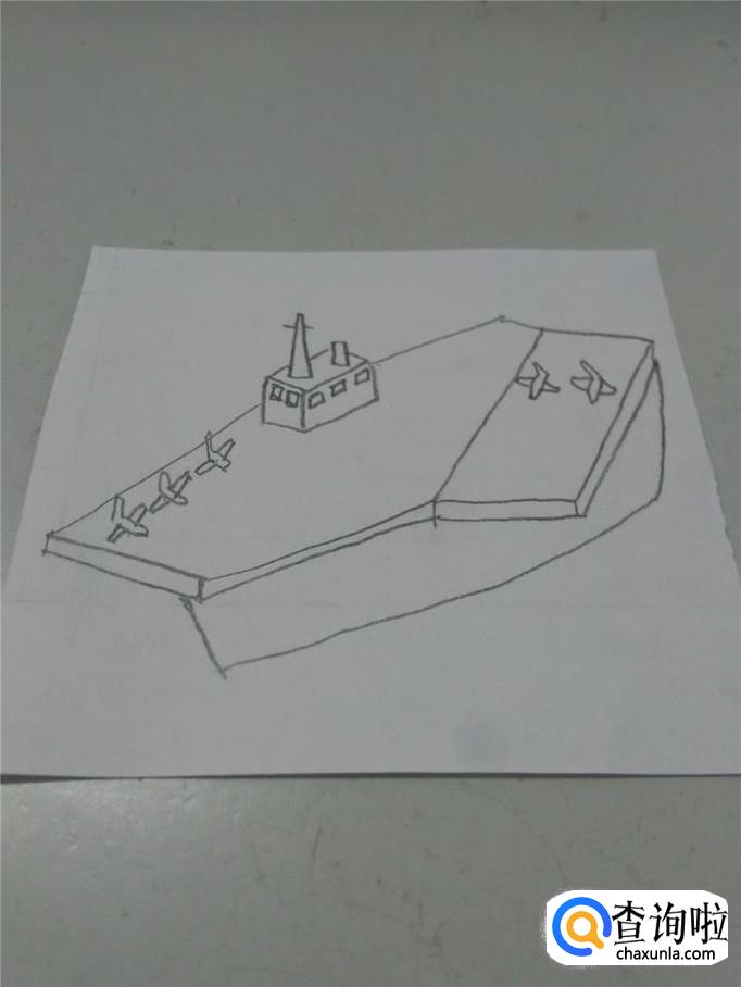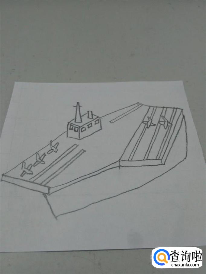 最后在甲板上画几条双直线,表示跑道。航空母舰就画完了。