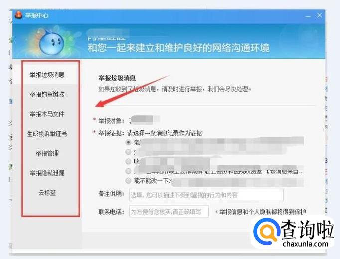 这里默认打开的是“举报垃圾信息”选项卡,会看到如下页面,按照提示进行选择、输入完成后再进行操作。