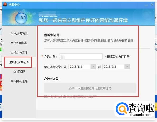 如下点击的是“生成投诉举证号”选项卡,打开右侧页面窗口,按照提示选择相应时间等完成后再点击下方按钮进行生存操作。