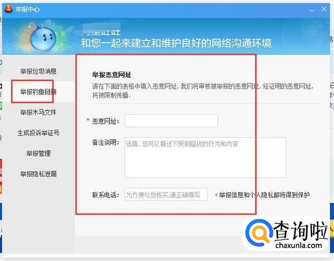 如下点击的是“举报钓鱼链接”按钮,会打开如下页面按照提示输入相关的信息与链接后再点击右下角的“提交”按钮,提交举报链接页面。