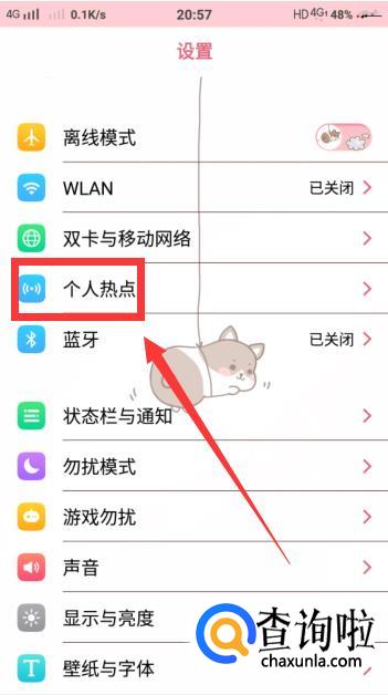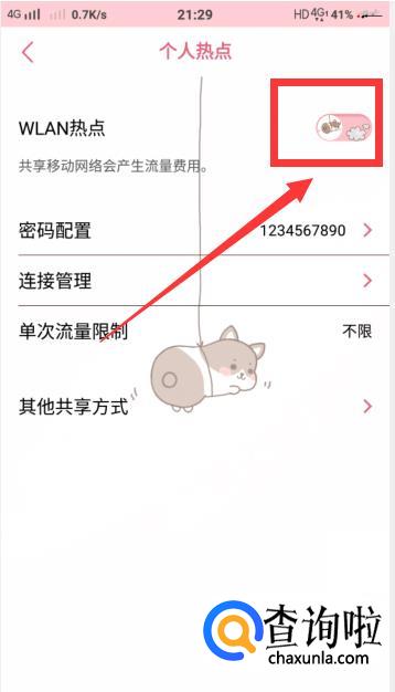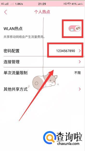 进入设置页面后,点击进入【个人热点】,然后打开热点,密码就在下面的【密码配置】一栏中,这样手机上面的热点就打开了。