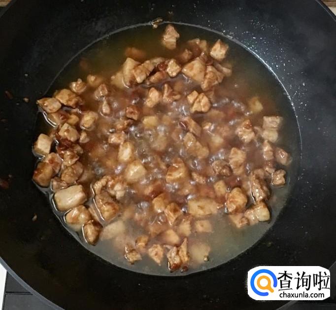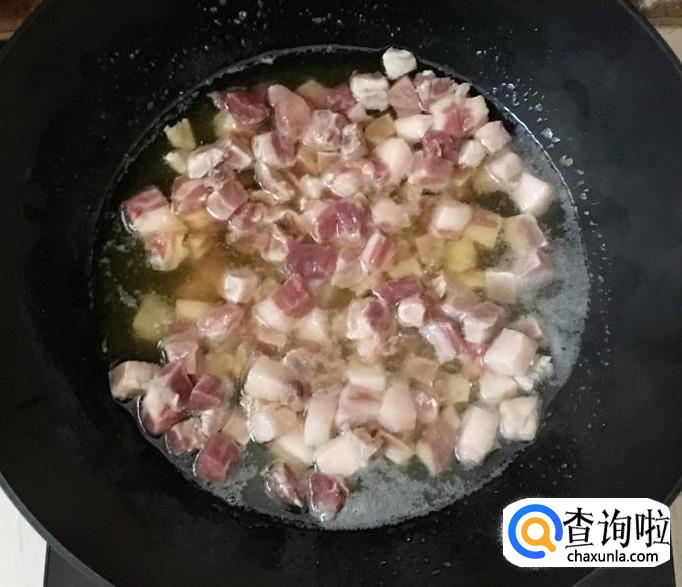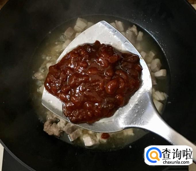 肥瘦相间的猪肉400克根据自己的喜好切成肉丁或肉片,热锅加入多一点的花生油把肉丁炒香后放入豆瓣酱继续炒香,最后烹入适量的料酒关火放凉备用。