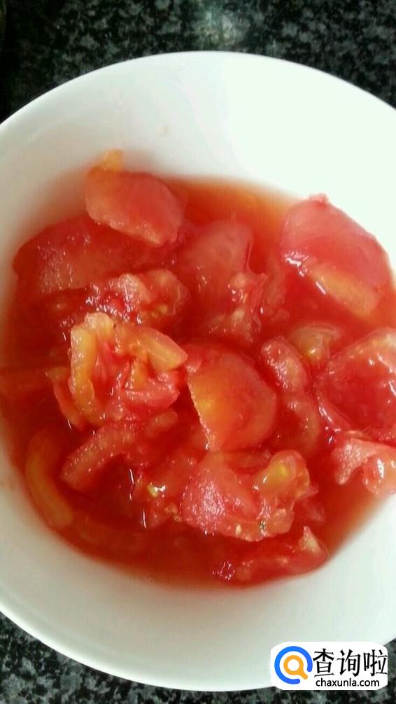 烧一锅开水,将番茄洗净,用刀在番茄顶端划开一个十字,然后再开水里煮1分钟后捞出,将番茄皮撕掉,放凉切块备用。