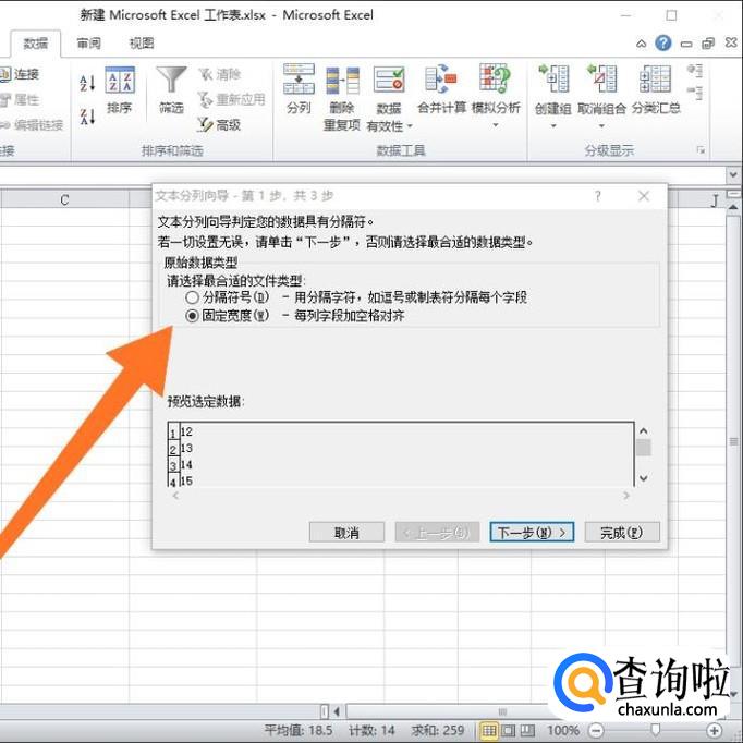 弹出“文本分列向导”对话框后,勾选“固定宽度”,然后点击“下一步”。