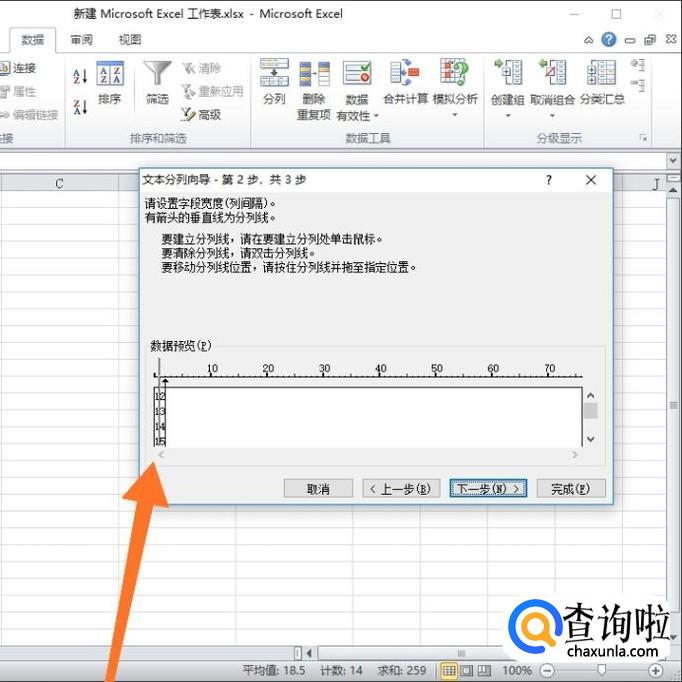 接下来把分列线移动到单元格分割处的位置,然后点击“下一步”。