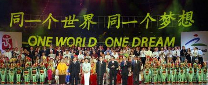 “同一个世界 同一个梦想”(One World One Dream),文简意深,既是中国的,也是世界的。口号表达了北京人民和中国人民与世界各国人民共有美好家园,同享文明成果,携手共创未来的崇高理想;表达了一个拥有五千年文明,正在大步走向现代化的伟大民族致力于和平发展,社会和谐,人民幸福的坚定信念;表达了13亿中国人民为建立一个和平而更美好的世界做出贡献的心声。