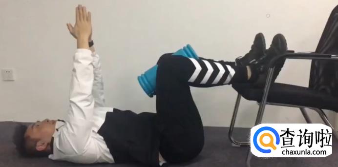 首先,做成如图所示的姿势,脚后跟发力带动骨盘后倾。膝关节夹紧泡沫轴或者枕头,手指尖够向天花板。