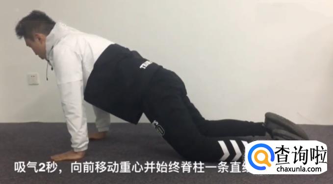 吸气两秒,向前移动重心并始终脊柱一条直线。保持动作,呼气四秒。