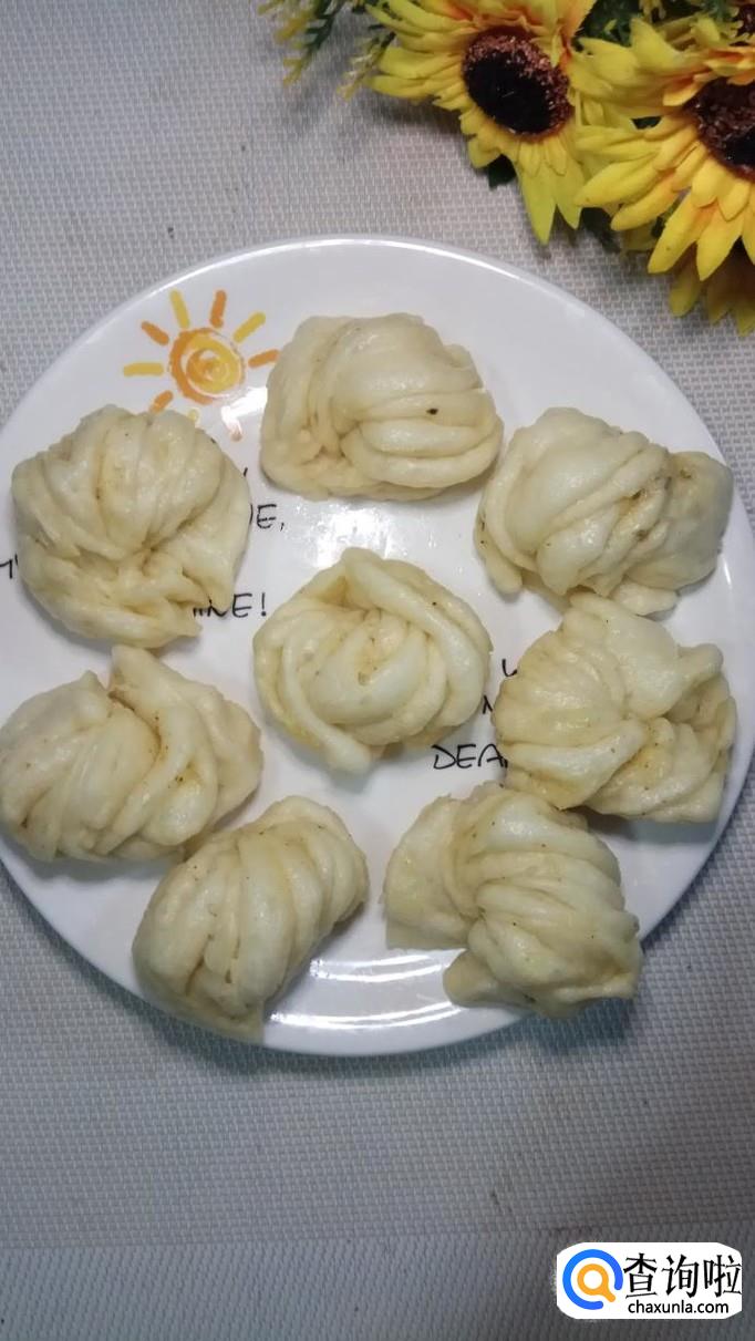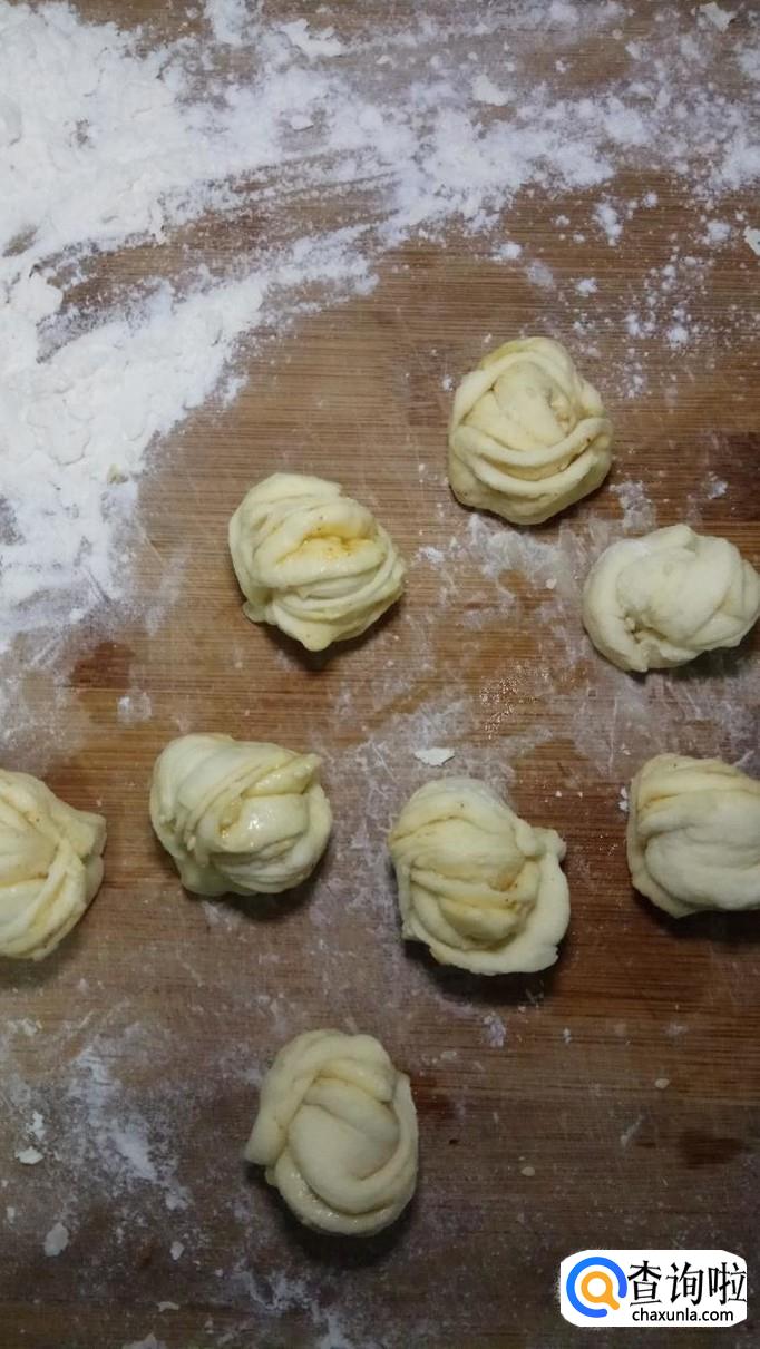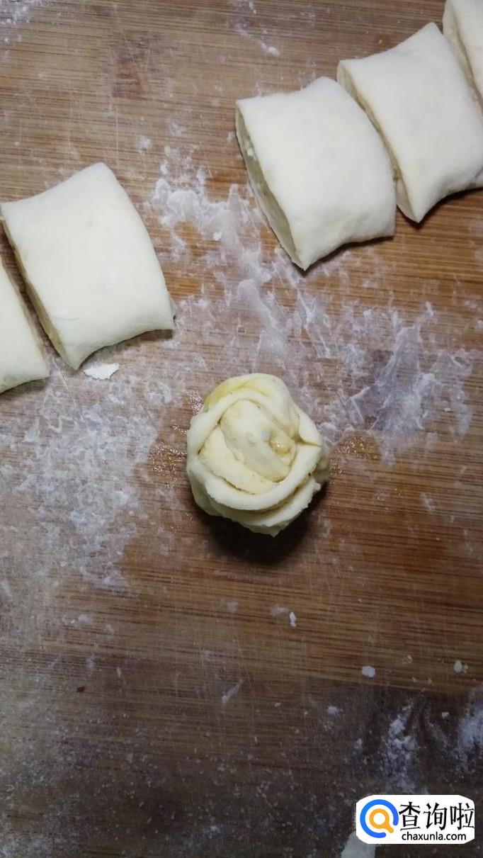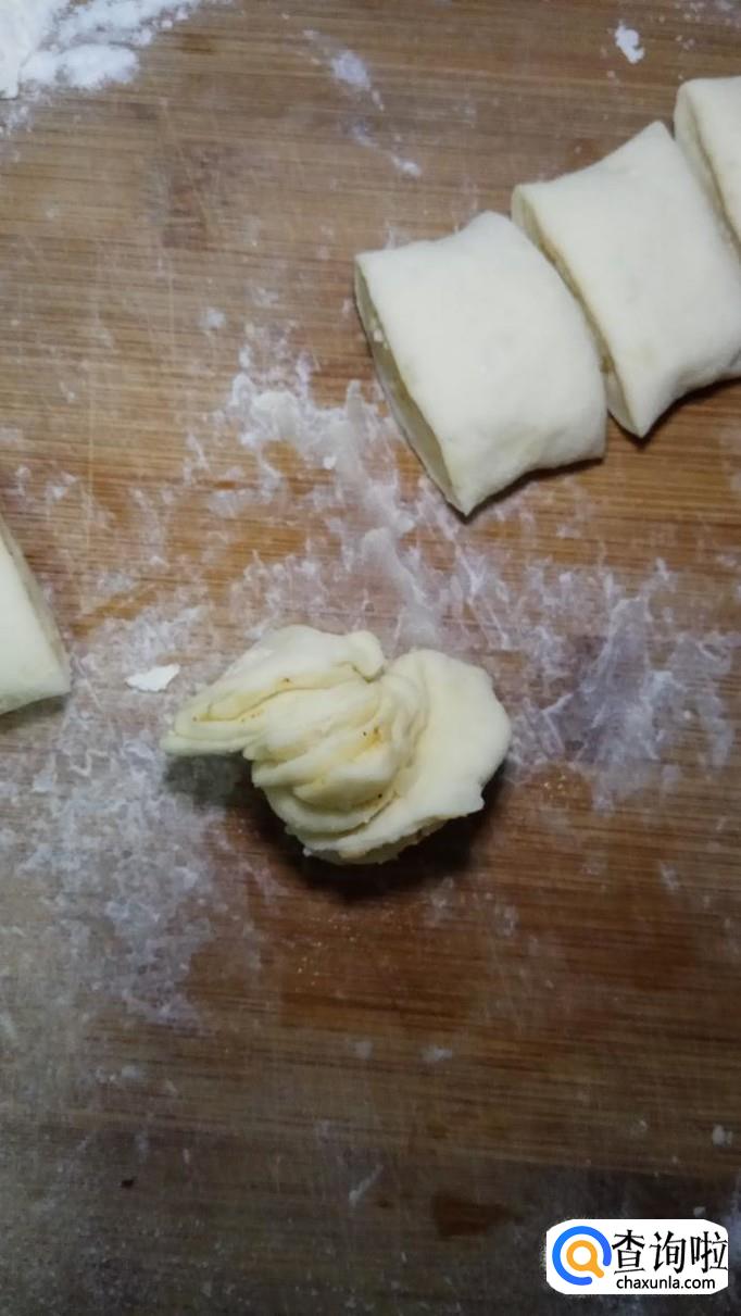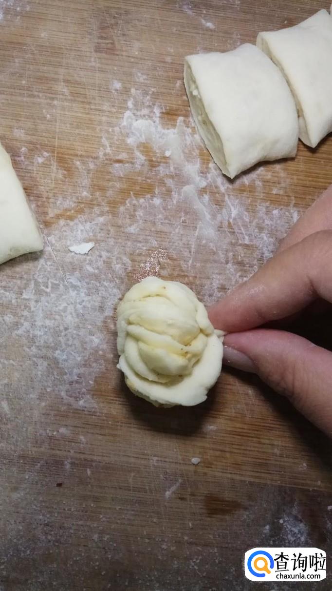 再将两端向中间按一下,在两边粘合住,用手使劲的捏牢。漂亮的花卷就做好了。