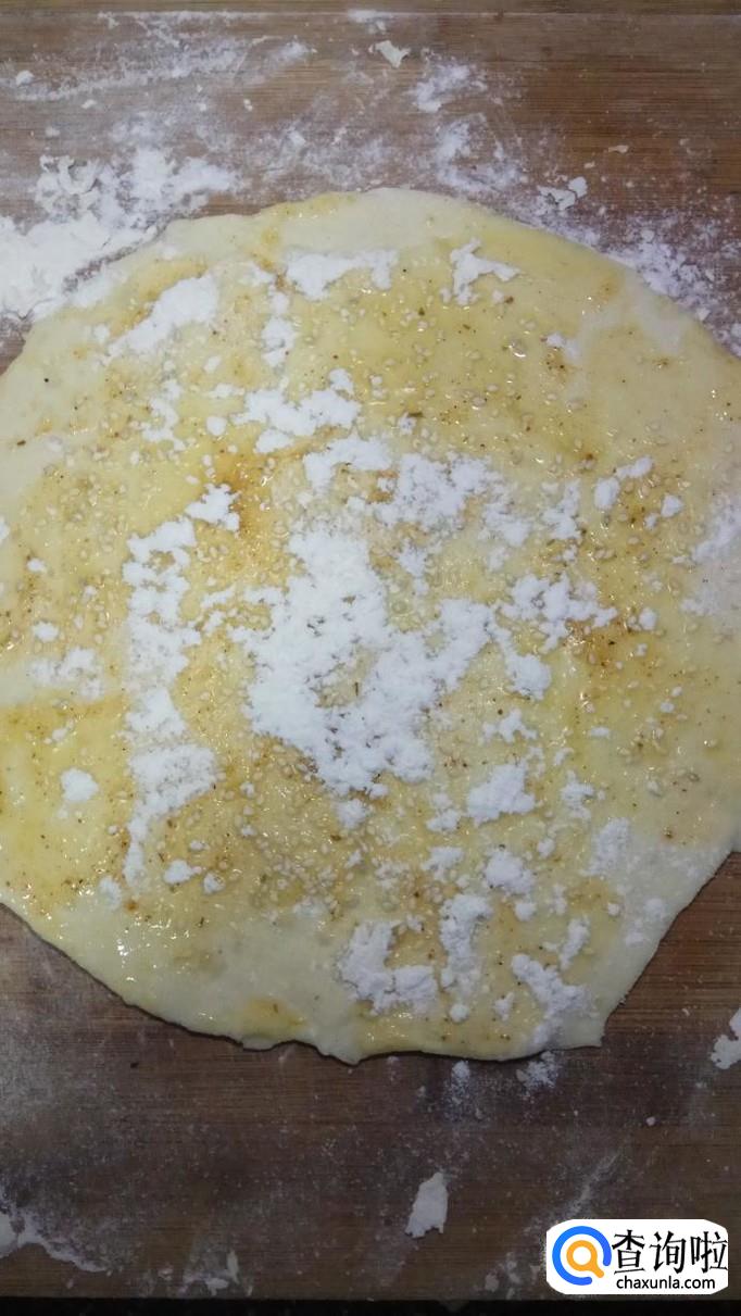 撒上一层白芝麻,再撒上一层干面粉,干面粉和熟油融合后,会形成油酥。从一头卷起来。