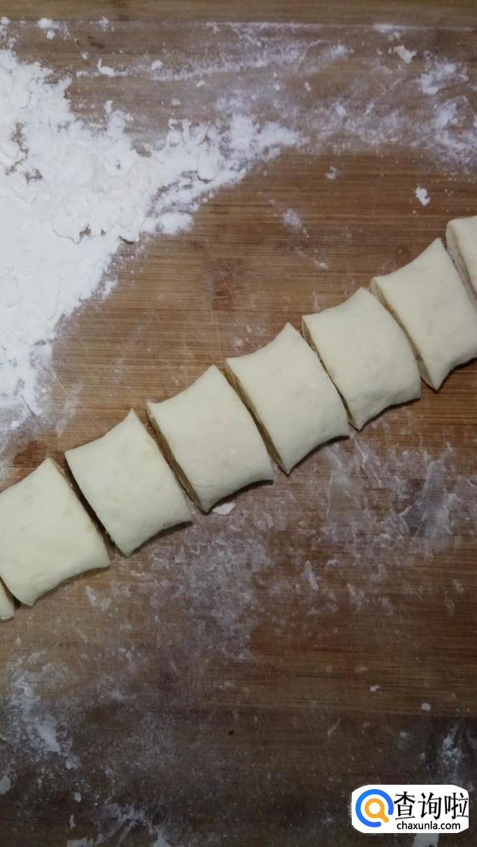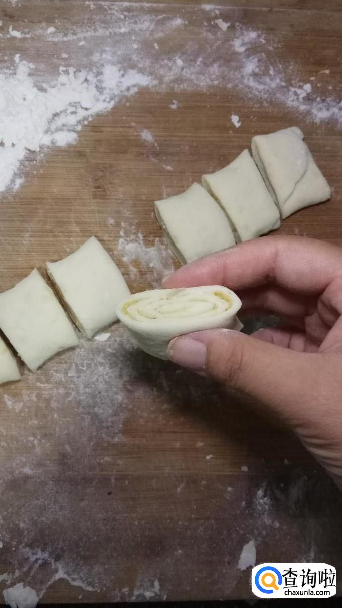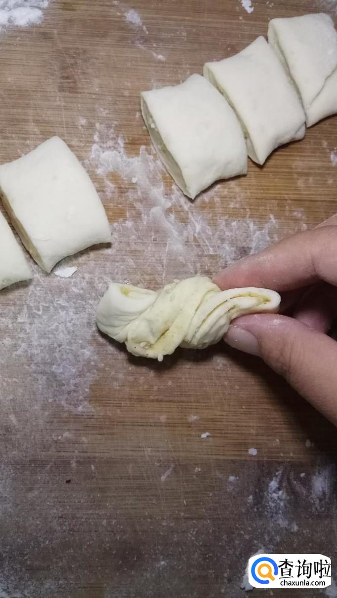 用刀切成小剂子,用手拿起来左右扭了一下,拧出花型。