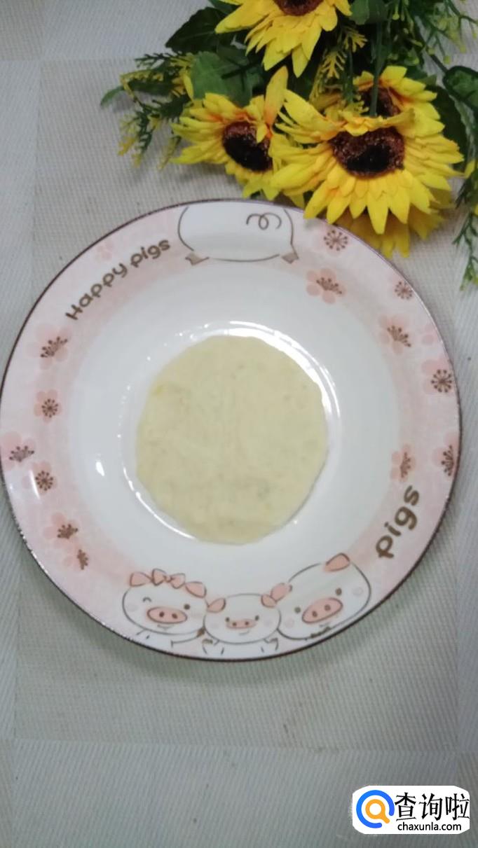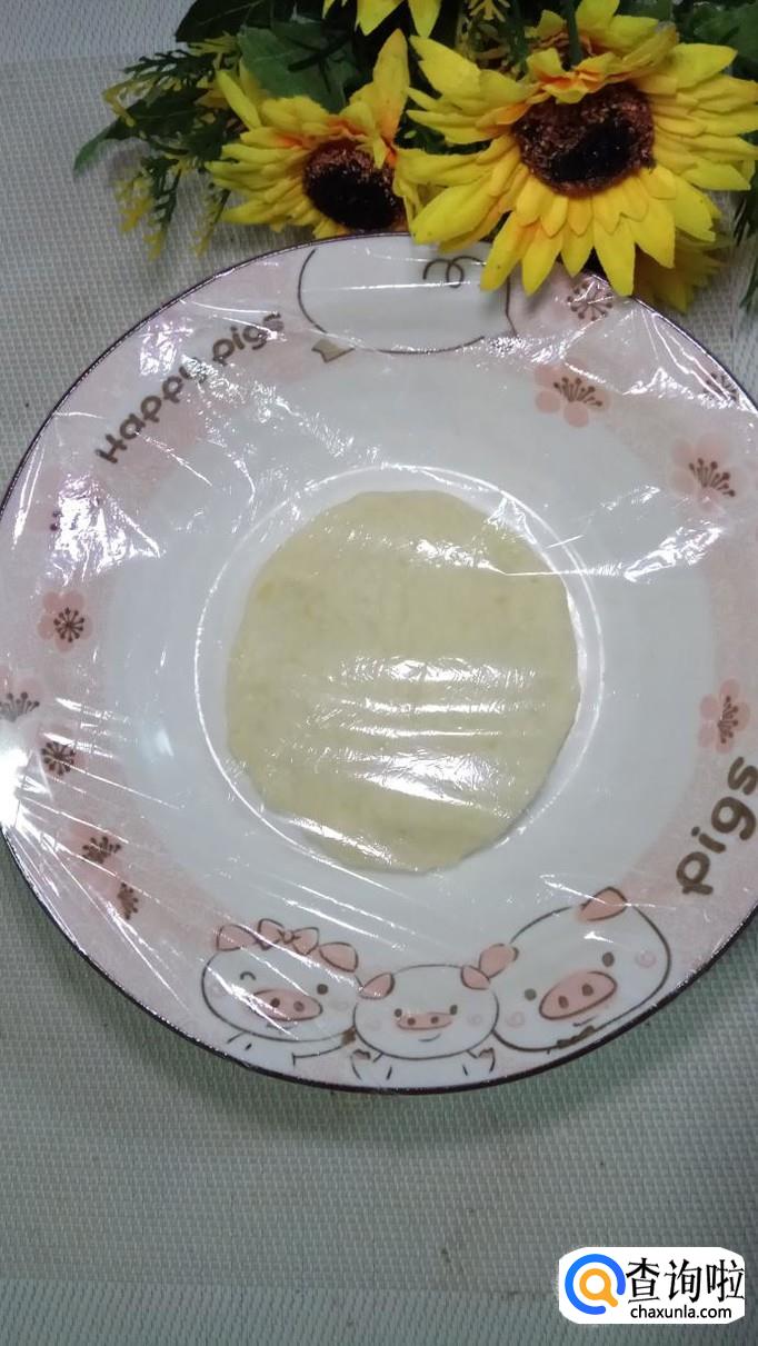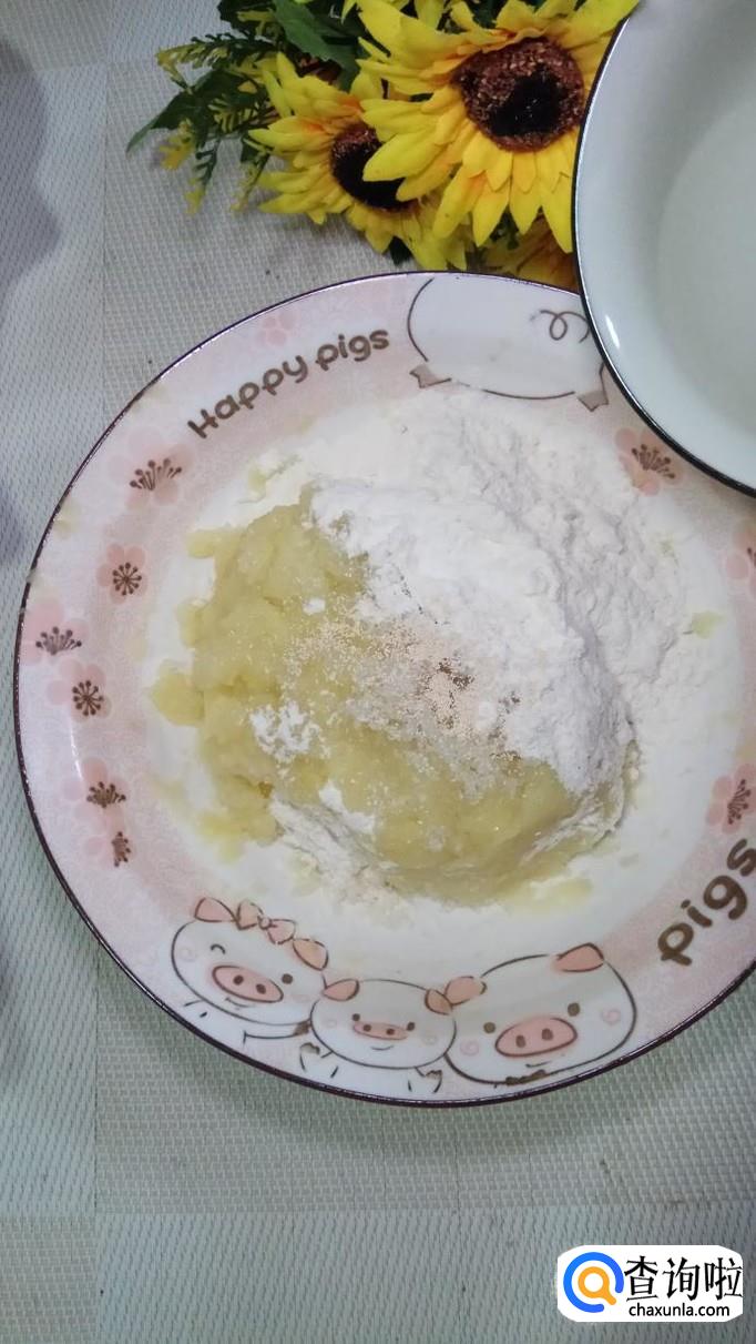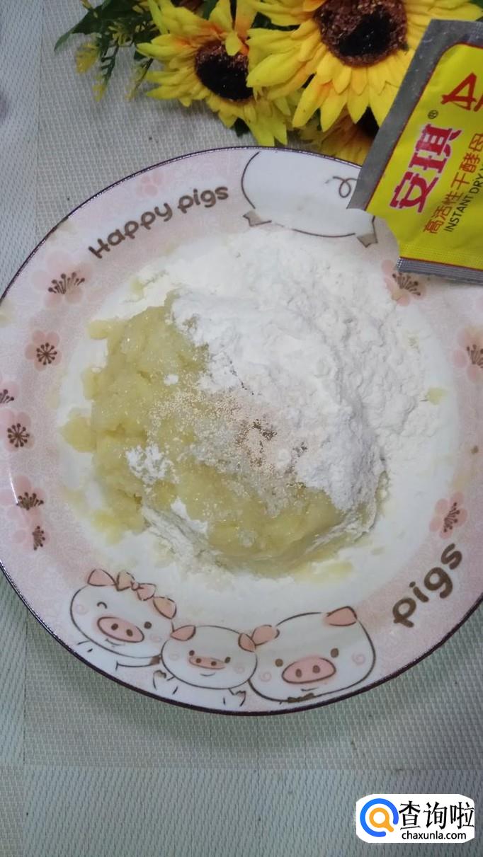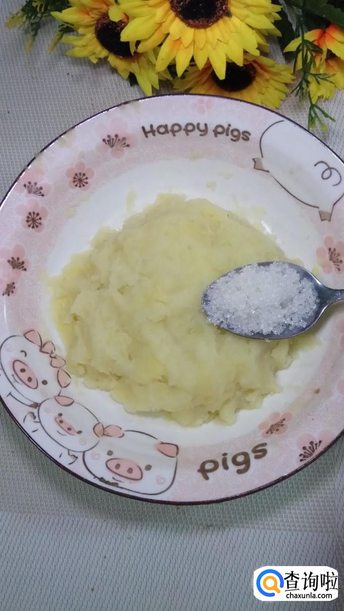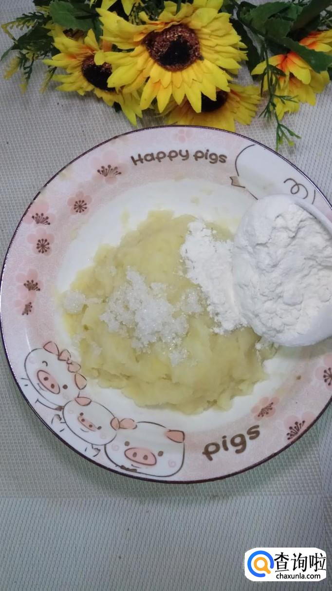 蒸好之后,取出来,用勺子压成泥,加入少许的白砂糖,再加入少许面粉,白砂糖会加快面团的发酵速度。