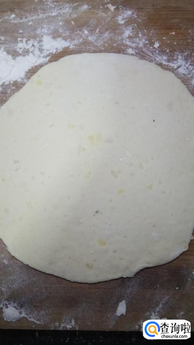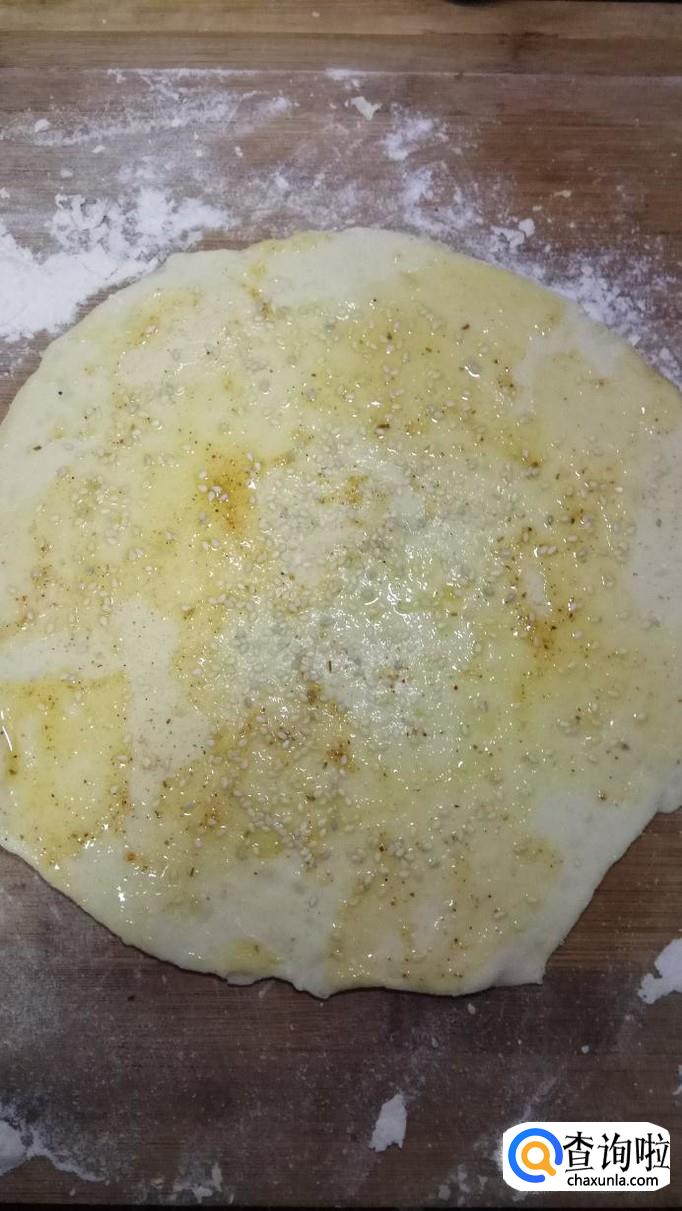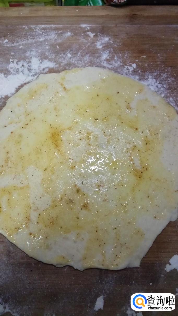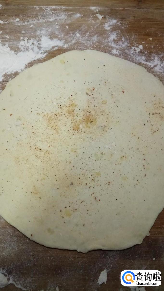 用擀面杖擀成片,撒上食用盐和五香粉,用手搓开,然后均匀的抹上一层食用油。