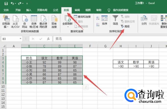 选中筛选的内容,之后点击“数据”,然后点击“高级”;
