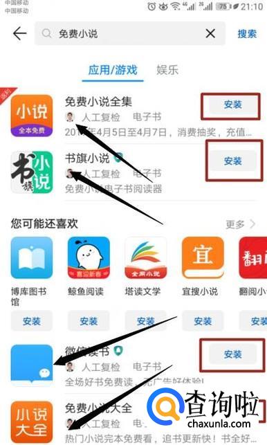 搜索出来的结果可以看到很多免费小说的软件,只需要根据我们自己的需求点击进行安装就可以使用了。