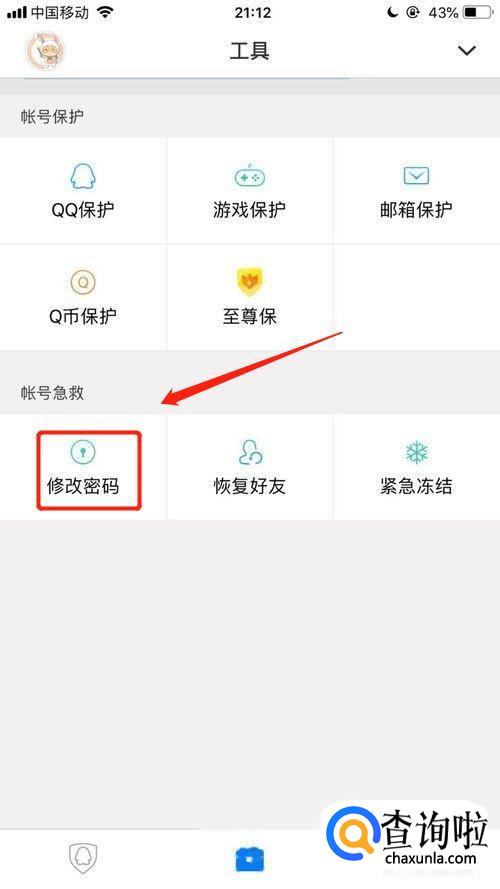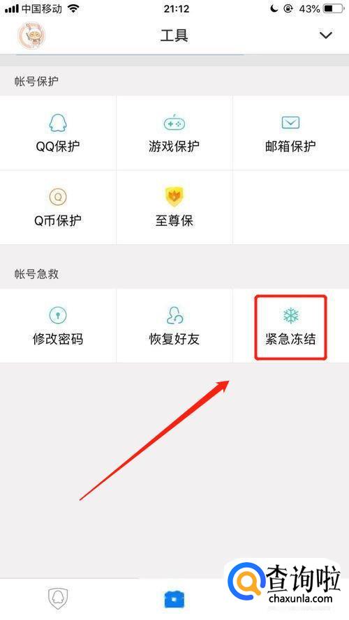 然后将“工具”界面滑到最下面,会发现“账号急救”中的“紧急冻结”选项,点击,开始冻结账户。