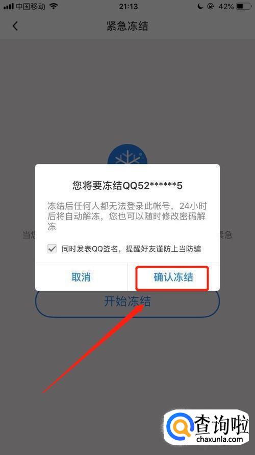 然后系统会向你确认要冻结账户的信息,以及提醒大家账户冻结之后,24小时无法操作,注意勾选“发表QQ签名选项”这样会通知大家的好友,最后点击“确认冻结”就完成账号紧急冻结了。