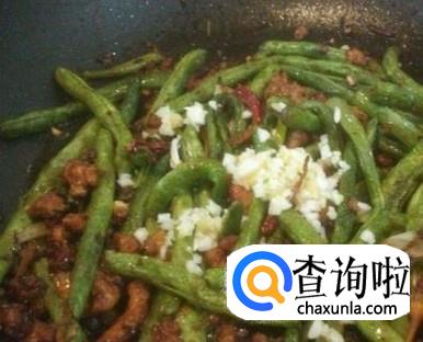 将豆角段放入锅中,放入蒜末,翻炒均匀,豆角要多炒一会儿,炒到熟透,期间,每隔一会儿,就往锅中添加少量的水,使豆角熟得更快、更入味,让豆角慢慢吸收水分,直到豆角熟透,锅中没有了汤汁,就可以出锅了。