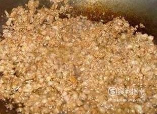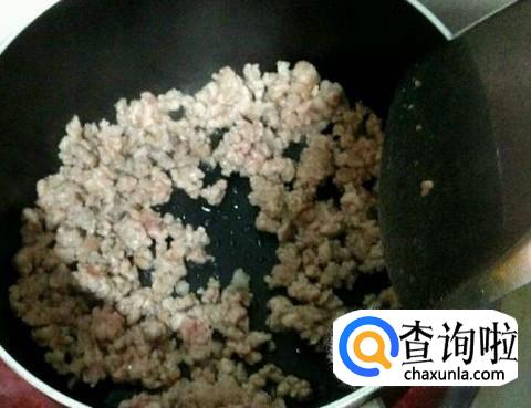 将肉馅放入锅中,用铲子均匀搅拌,再加入适量的酱油,使肉末更香。