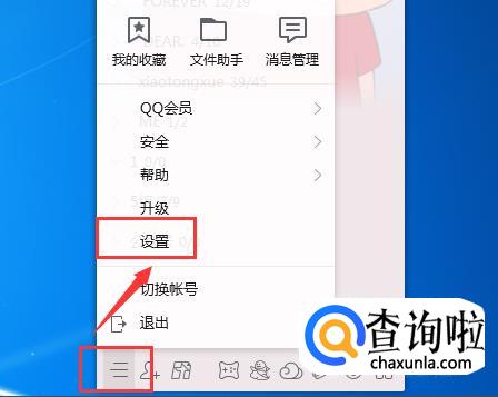 在电脑上登录自己的QQ账号,然后点击QQ主页左下角三条横线标志后,选择“设置”,如图所示。