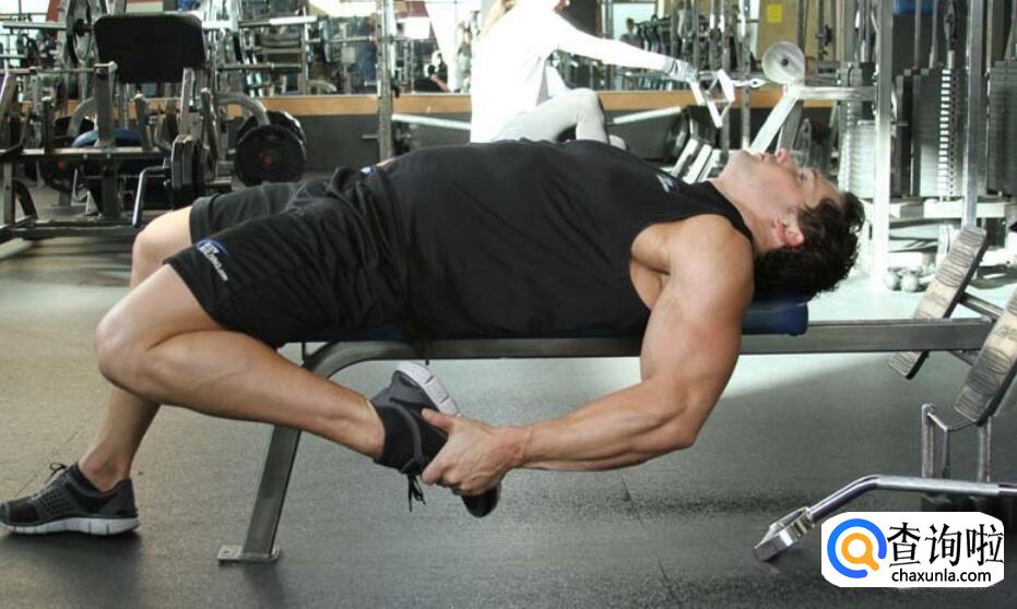 1.躺在一个平椅或台阶上,将一条腿和一条手臂悬在一侧。2.弯曲膝盖,抓住脚的顶部。当你进行这个动作时,注意不要拱起下背部。3.肚脐眼到脊柱保持中立,将脚向下按在你的手里,加大臀部的拉伸,将握住的这条腿的臀部向天花板挺起。4.换另一边重复以上动作。注意:不可强力按压,动作应轻柔缓慢。