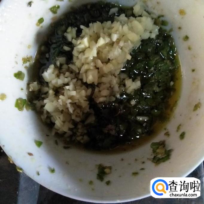 锅中加油,油8分热时将其舀出,放入辣椒中,然后加入蒜末,搅拌均匀