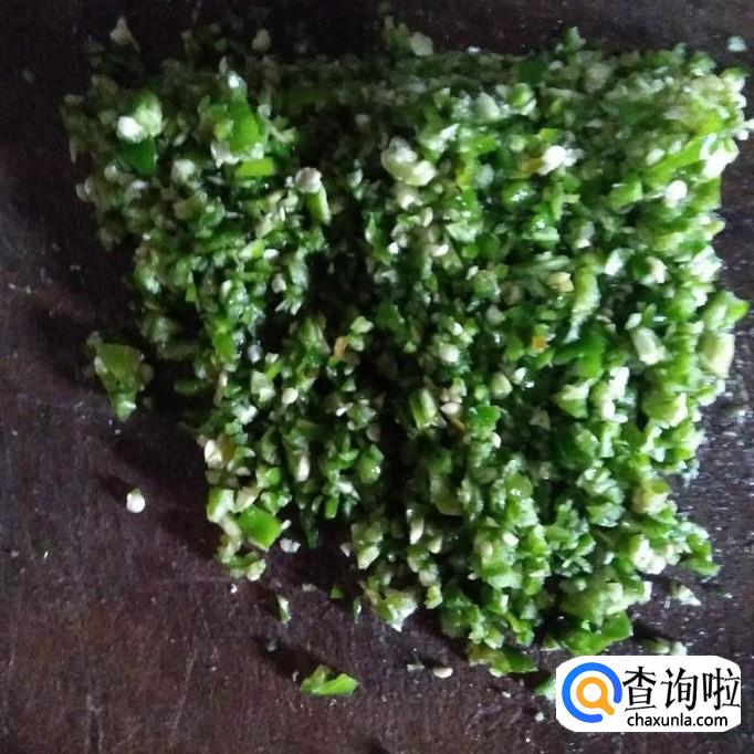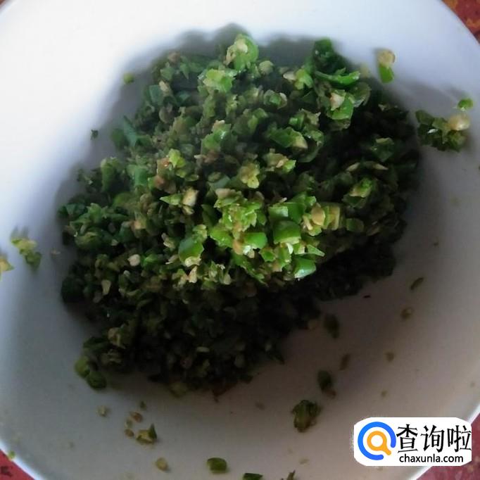 辣椒砍成末,如下图1,然后将其放入热锅中煎炒1分钟,舀出,如下图2