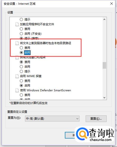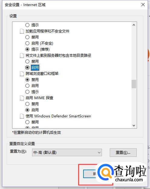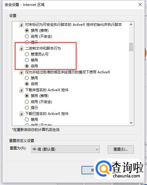 弹出的安全设置对话框中的“二进制和脚本行为”选择“启用”。
