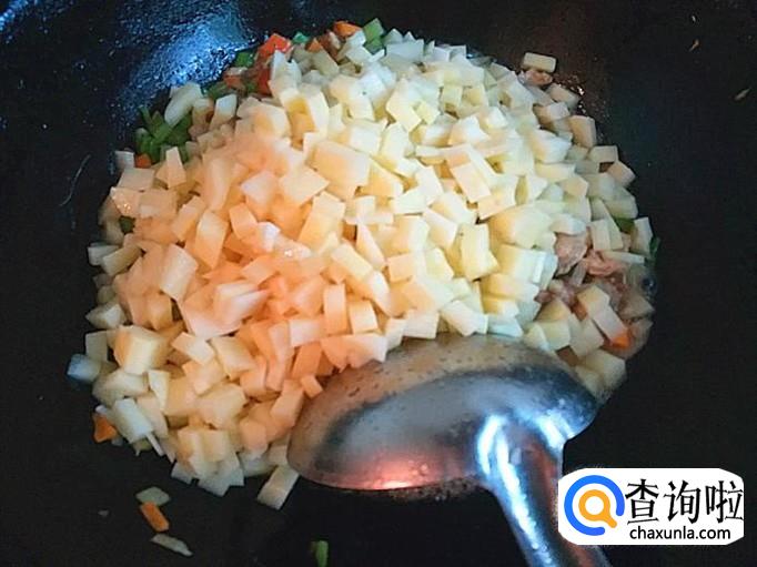 再加入切好的土豆和食盐及其它自己喜欢吃的调料一起翻炒入味。