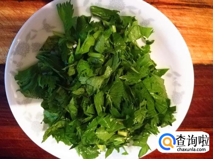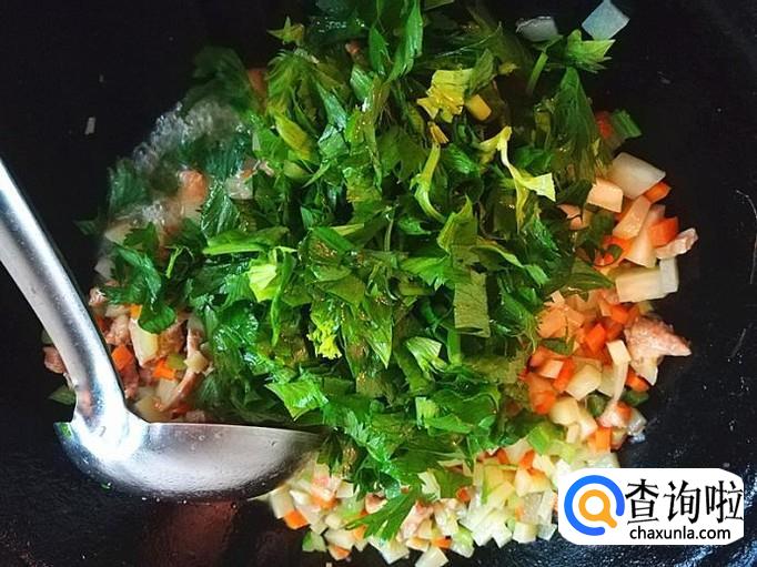 加入切好的芹菜叶子一起炒2分钟。