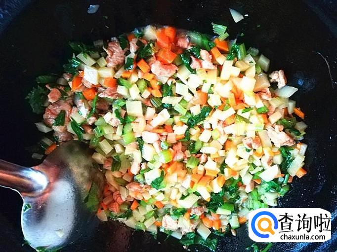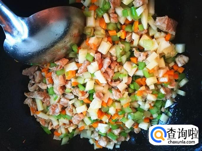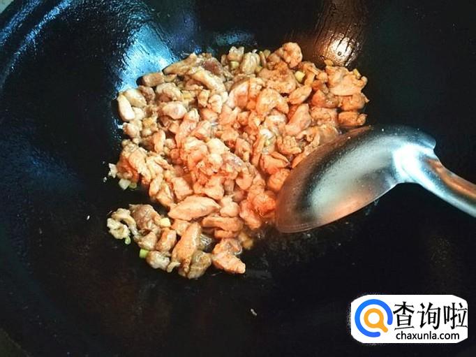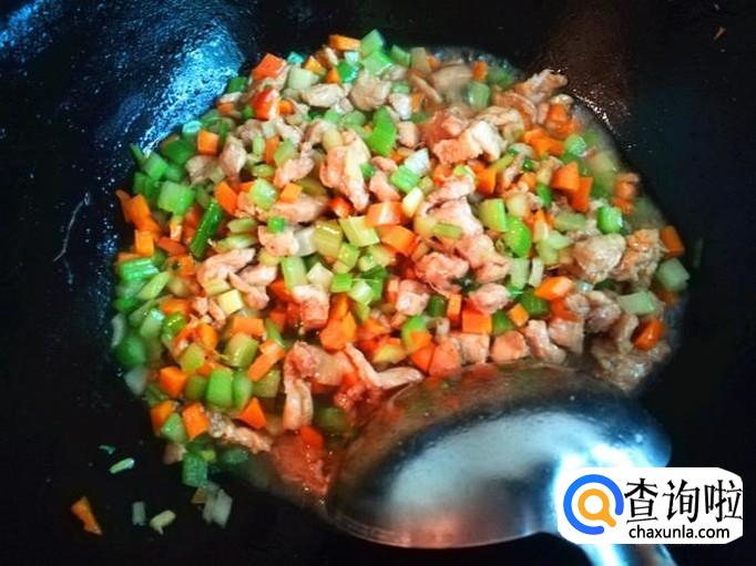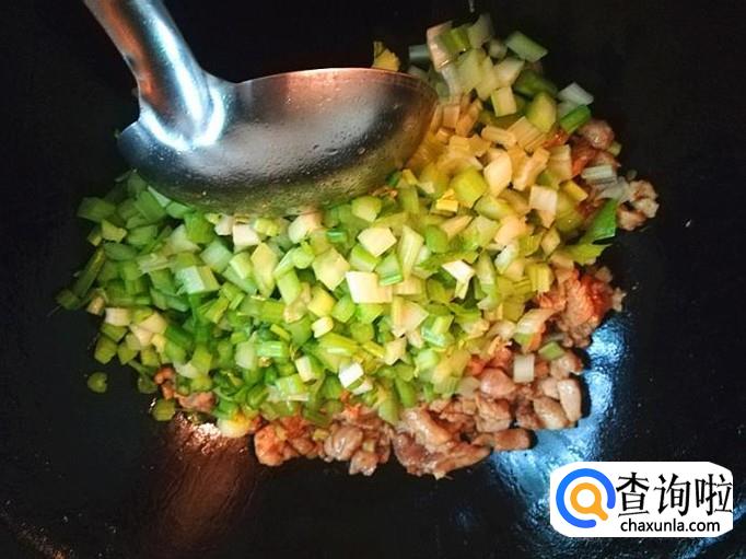 上炒菜锅,加入适量的植物油烧热,倒入腌制好的肉块一起爆炒片刻,再加入前面准备好的芹菜丁丁一起翻炒入味。